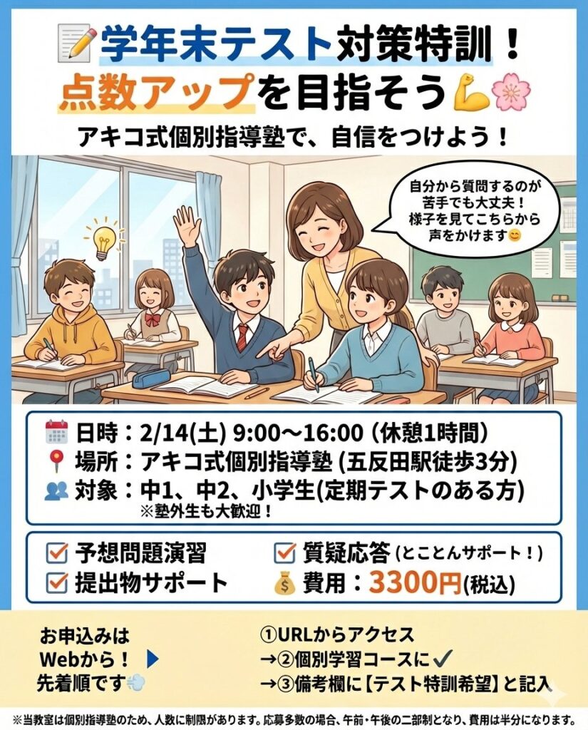 学年末テストに向けた、テスト対策特訓を開催します。予想問題に挑戦したり、分からない問題の質問をしたりして、点数アップを目指そう!