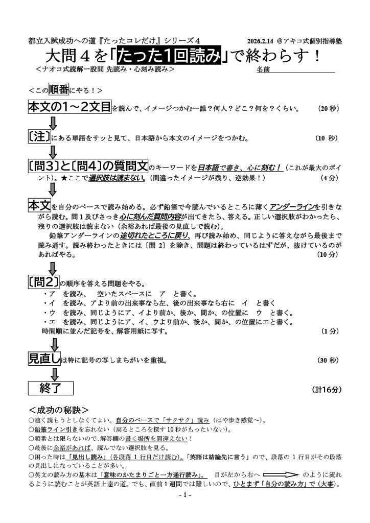 都立受験英語対策講座 お知らせ 学習・勉強法 2026.02.12 資料を安部先生よりいただきました。オープンにして皆さんにつかってもらえれば、とおっしゃっていただけたので、公開します。自分で実践するもよし、塾で先生と勉強するもよし。 14日の都立英語対策特訓、空きございます。 資料の内容を、直接安部先生から教えていただけるチャンス!点数アップしたい皆さん、ご来室下さい。 SHARE POSTS LINE 前の投稿へ お知らせ一覧へ 次の投稿へ